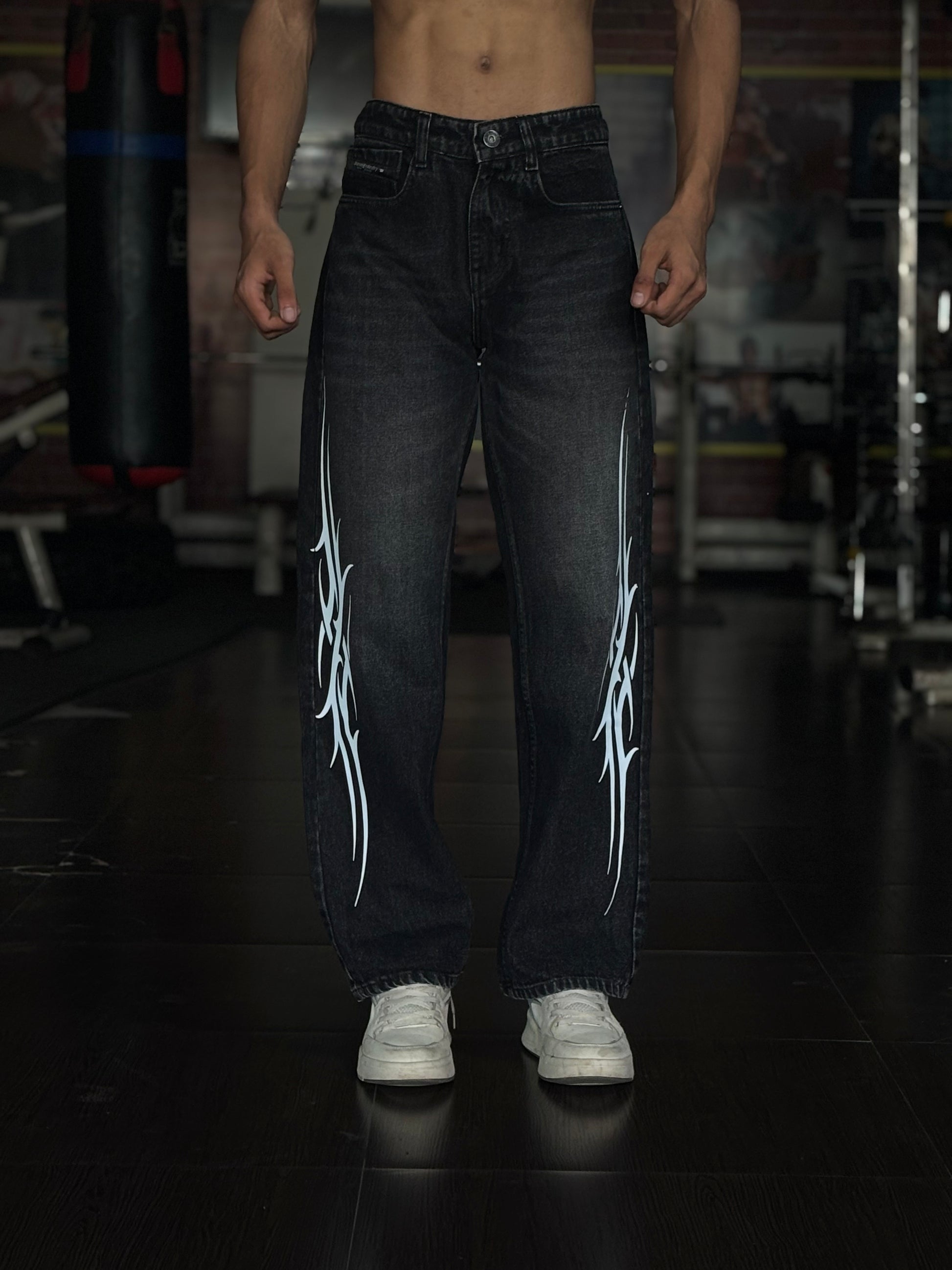 Set the street on fire—quietly. The Ghostflame Baggy Denim brings tribal heat to a blackout palette, fusing early-2000s rebellion with modern streetwear flow. Featuring white flame-inspired tribal graphics scorching down both legs, this piece is built for those who walk loud without saying a word.